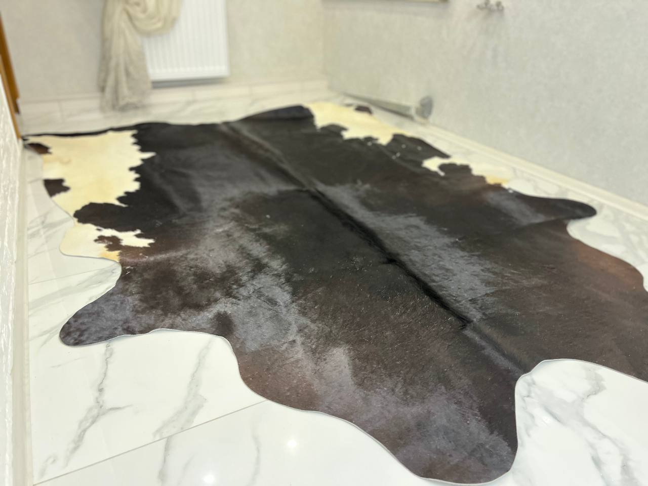 Виріб природних коричневих відтінків гармонійно вписується практично в будь-яку обстановку. Воно буде чудово виглядати біля каміна, поруч із диваном або навіть на підлозі у лазні. Коров’яча шкіра відрізняється високою вологостійкістю. Це рідкісний матеріал, який можна стелити у ванній кімнаті.